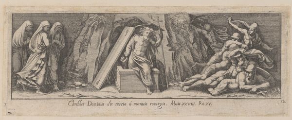 This is Francesco Villamena’s etching of the Resurrection. Dominating the center is the figure of Christ, emerging triumphantly from the tomb, holding a cross, the symbol of his victory over death. Note how the motif of the 'sleeping soldier' appears—unaware of the divine event unfolding. This links back to ancient Roman depictions of guards at the emperor’s tomb, a symbol of earthly power rendered helpless before the eternal. Consider also the grieving women, their sorrow a poignant contrast to Christ’s rising, a sorrow that echoes in countless depictions of mourning across cultures. The cross itself has undergone a fascinating transformation over time. From its initial brutal representation of execution, it evolves into a symbol of hope and salvation, deeply embedded in the collective psyche. These symbols are more than mere representations; they are conduits of cultural memory. Villamena masterfully taps into this potent force, engaging us on a profound, subconscious level.