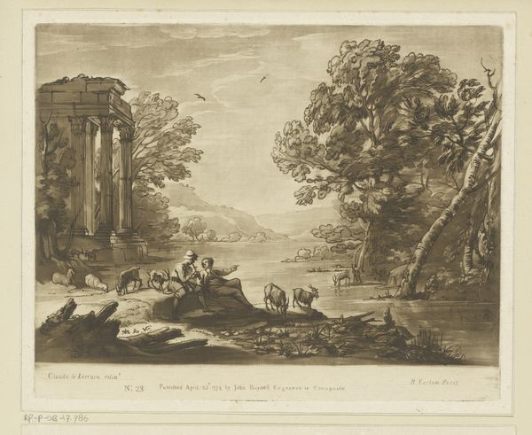 Curator: "Heuvelachtig landschap met vee en drie musicerende herders"—that’s “Hilly Landscape with Cattle and Three Music-making Shepherds,” attributed to Richard Earlom, possibly dating to 1774. It’s an engraving currently held in the Rijksmuseum collection. It strikes me as quite idyllic at first glance, a carefully rendered pastoral scene. Editor: I’m drawn in by the interplay of light and shadow; it's quite theatrical. The grouping of the figures, particularly the musicians, lends the image an almost classical sensibility, like a stage tableau, perhaps inviting commentary on social dynamics. Curator: Indeed. Earlom, known for his reproductions, worked within the context of the Enlightenment’s burgeoning interest in classical themes and the picturesque. These images circulated widely, influencing ideas about nature and its role in society. Think about the aristocracy trying to recapture Arcadia. Editor: It makes me wonder about accessibility then. This wasn't art for everyone, was it? Were these images deployed to further establish societal hierarchies by emphasizing idealized rural life and reinforcing particular values tied to class and land ownership? The figures’ seemingly carefree existence becomes problematic in that context. Curator: That's an excellent point. The market for these prints served specific socio-economic strata. However, within the image itself, you can discern a kind of imagined community: the shepherd musicians playing, the cattle peacefully grazing...there’s an imagined harmony within the social and natural order, a vision not necessarily reflective of the actual lived experiences of rural communities. Editor: And the role of the “artist” in constructing and mediating this image, how it reflects both individual sensibility and larger social mandates about the visual representation of labour, leisure, and societal harmony—it begs the question of what these visual codes and this artistic labor serve. There's a political charge inherent in the aesthetic choices made here. Curator: It is complex. Ultimately, Earlom’s engraving represents more than a simple landscape. It provides a glimpse into the social, economic, and artistic discourses circulating during its creation, making it a compelling artifact. Editor: Absolutely. And understanding that layered context helps to interrogate its underlying assumptions and reimagine its role within our current cultural landscape.