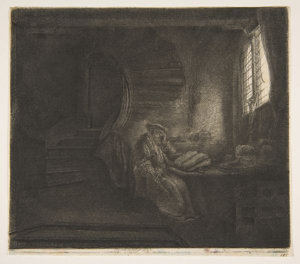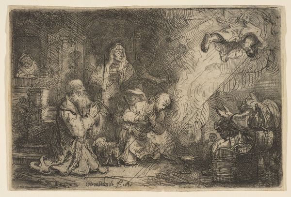 Ferdinand Bol created "The Family in the Room," a print rich in texture achieved through etching. The piece is dominated by deep shadows, punctuated by a concentrated light source from a window. This contrast not only illuminates the scene but also structures the narrative focus around the central figures. Bol’s handling of light and shadow serves a dual purpose, creating depth and imbuing the scene with a sense of intimacy. The textures, rendered through fine lines, add layers of meaning. One might consider how this careful articulation resonates with ideas from the period, where domestic scenes were increasingly valued for their emotional and moral significance. Bol uses light to draw the viewer’s eye to the quiet moment between mother and child. Consider how the formal choices of composition, texture, and light interact to create a visual language. This language speaks not just of domesticity but of the broader cultural codes governing representations of family and virtue.
