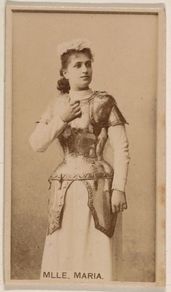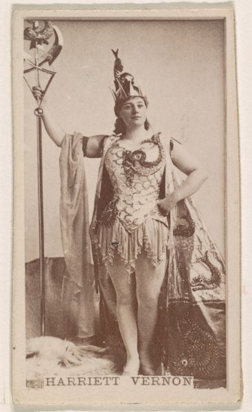 Editor: So, here we have "Mlle. Goetz," from the Actors and Actresses series, a photographic print from between 1885 and 1891 by Allen & Ginter. It's fascinating – she looks like she’s about to break into some seriously impressive dance. What strikes you most about it? Curator: What strikes me? The utter fabrication, darling. Not of the photo itself, mind you, but of the *image*. Allen & Ginter sold dreams, slipped them into cigarette packs like little promises. That’s not *really* Mlle. Goetz. That's the orientalist fantasy *du jour*, all packaged up for easy consumption, exoticism made safe, affordable, flammable even! I wonder, what's her real story? Did she have a say in this character? Editor: So you see a kind of... manufactured persona? That makes sense, with it being an advertisement. Did that kind of exoticism have a particular appeal then? Curator: Honey, it *always* has an appeal, hasn’t it? The shimmering other, promising a world beyond our dull reality. But back then, with burgeoning mass media and this hunger for new visual experiences, it was potent! Look how they carefully controlled every detail—from the heavily embellished costume to the staged pose. Notice how they mimic Japanese prints with the asymmetry and flat perspective. What message do you think this image had on the audience then? Editor: I suppose it was feeding a desire to explore other cultures but in a very controlled and perhaps even misleading way? The cigarette company made a fortune doing so. It's kind of sad, isn't it? This packaging of culture for profit. Curator: Precisely. But art, even commercial art, is rarely simple. Perhaps Mlle. Goetz was in on the game. Perhaps she subverted it in ways we can't quite grasp now. That tension, that ambiguity... that’s what makes it fascinating, right? Editor: Definitely gives me a lot to think about beyond just the surface-level exoticism. Thanks!