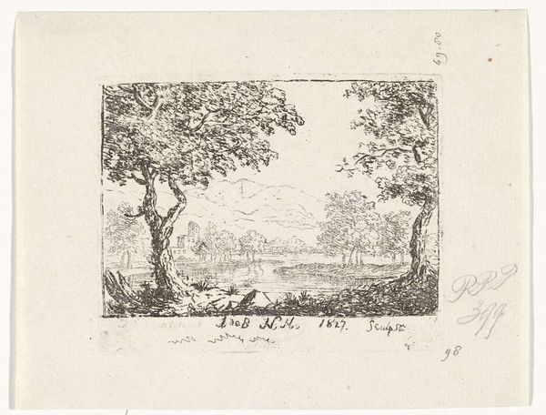 Cornelis Ouboter van der Griendt made this etching, "Landschap met ruïne," sometime in the first half of the 19th century. It depicts an idealized landscape featuring a ruined building, a large tree, and a figure near a stream. Landscape prints like this were very popular at the time, but they were more than just pretty pictures. In the Netherlands, the creation and collecting of art was intertwined with national identity. The Dutch Golden Age was a recent memory, and artists looked back to that period for inspiration. But this interest in history often had a political dimension. Ruins evoke the past but also suggest change and even decay, prompting viewers to reflect on their present. This artwork uses an image of nature to engage with pressing social questions. To truly understand the print, one might consult historical records, art criticism from the period, and biographies of the artist. By studying its context, we can better appreciate its historical and cultural significance.