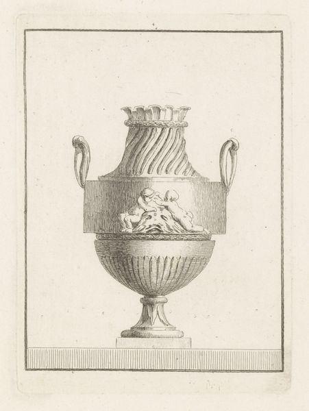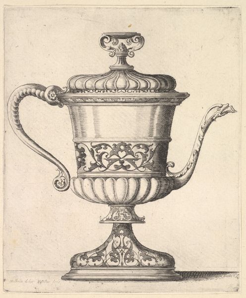 Curator: Looking at this image, the most immediate impression for me is one of formality. It feels very consciously arranged, perhaps even severe in its detailed rigidity. What do you think? Editor: That's interesting. This print captures a lidded pitcher, known as a "Schenkkan met deksel" in Dutch, dating back to 1667. It’s an engraving done in metal, by the French designer Françoise Bouzonnet. Looking closely, the handle shaped like a serpent coils upward, quite playfully contradicting that severe feel. Curator: Yes, I see it now. And there's a lot more life bubbling beneath the surface, isn't there? All those figures depicted around the belly of the pitcher; what scenes do you make of them? It appears there's quite a bit of dynamic action, something quite emotional seems to be conveyed with all the tension and dramatic gesturing. Editor: Well, such vessels weren’t just utilitarian; they conveyed status and cultivated an engagement with historical or mythological narratives. The figures hark back to antiquity and align with a wider Baroque trend in decorative arts towards allegorical ornamentation, recalling tales of gods, heroes, and elevated rulers. It speaks of wealth and refinement, showcasing access to the past as a way to bolster prestige. The very design blends pagan symbols like the serpentine handle, hinting at the cunning and dangerous power that shapes political ambitions of the era. Curator: So it’s not only about personal identity but social maneuvering then, projecting an image of power through appropriated history. That connects with some theories around social imitation, with people constantly seeking to perform the expected attributes of their selected cohort or their aspirational social standing. I suppose such cultural markers were not so dissimilar in function to a status-display object or practice from our own contemporary moment. The pitcher and print may serve as more than mere artifact; these forms act as both the reflection of and the aspiration towards ideals of civility and dominion. Editor: Indeed, visual artifacts are frequently deployed as the carriers of loaded significance; perhaps objects as witnesses might speak louder about social practices and customs than textual reports could ever attest. In conclusion, what initially seemed just a decorative object unfolds to offer significant testimony about that age's artistic idioms and social conduct. Curator: Exactly. It seems beneath every surface, there lies something of value waiting for keen eyes to uncover.