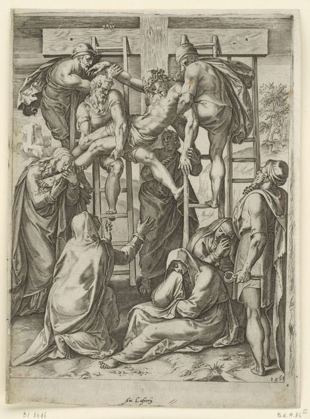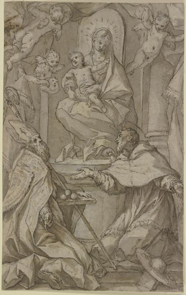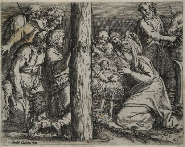 Editor: This drawing, "The Adoration of the Shepherds," date unknown, by an anonymous artist, has such a raw, immediate quality to it. What story does it tell from your perspective? Curator: Well, consider the context. Religious art like this was often commissioned by the church or wealthy patrons. How do you think that affected the way these stories were presented to the public? Did it reinforce the power of the church? Editor: Possibly. The drawing also shows the shepherds, common folk, are present at this miraculous event. Curator: Exactly. What might that say about the intended audience and the message being conveyed about the accessibility of faith? Consider the politics of imagery in the era it was created. Editor: I see! It’s about showing the universal appeal, not just the elite. I hadn't thought about it that way. Thanks!