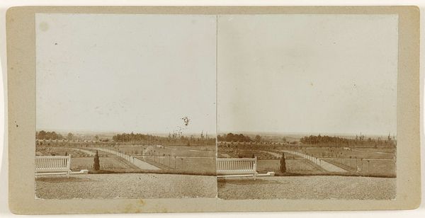 This is a stereograph titled 'Sportactivieteiten op een grasveld,' or 'Sporting activities on a lawn,' made by Geldolph Adriaan Kessler. This image offers a glimpse into the social life of the late 19th or early 20th century. The figures, all dressed in white, are engaged in leisurely sporting activities on a vast lawn. The monochrome palette lends the scene a nostalgic, almost dreamlike quality, emphasizing the historical distance between then and now. The composition, divided into two halves, invites us to consider how such images were consumed and understood. Who were these people, and what did engaging in sports mean in their lives? Was it a display of health, wealth, and social status? Kessler's lens captures a moment of apparent ease, but it also subtly hints at the complex social dynamics at play. What are the unspoken rules that govern who gets to play, and where? Ultimately, this stereograph makes me think about leisure, identity, and the ways in which we construct narratives of ourselves through recreation.