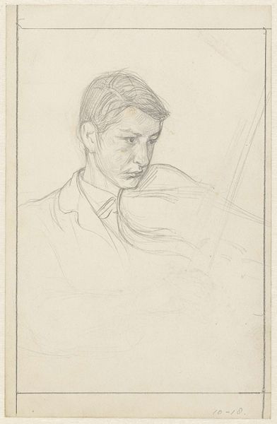 Curator: This is Jacob Kainen's "Eugene," created in 1946 using etching and graphite on paper. Editor: The hatching really leaps out—it's incredibly expressive! There's a tension between the crisp lines defining the face and suit and the almost frantic scribbles behind him. Curator: Yes, let's examine that interplay of line and texture more closely. Notice how Kainen employs a dense network of fine lines to model form, particularly around the eyes and cheekbones, lending the figure a distinct three-dimensionality. Editor: Beyond the technique, that intensity translates into the subject’s gaze, too. I wonder, what sort of archetype does "Eugene" represent? Is this a portrait of someone burdened by the postwar era, perhaps? Curator: Potentially. The subject’s attire suggests a man of the time—the suit and tie being markers of professional identity, and this adds layers of interpretation that are certainly welcome to examine. But from my perspective, those formal components allow for balance against what could read as an uncomfortably stark expression. Editor: I'm struck by how the artist chose to include his name so explicitly in the picture; the signature’s not at all discreet. Curator: That could signify a direct claim on the artwork, further emphasizing Kainen's control over the etching process and asserting his presence within the composition itself. It reminds us the process by which it came to life is as important as the identity of the subject, “Eugene.” Editor: In that context, then, the lines might signal not only character and the person they depict but also become almost seismographic readouts of the maker’s process. It's less about a realistic depiction and more about what it takes to create the art object itself. Curator: Precisely! The varying line weights and densities across the plane serve to flatten the portrait and make the viewer more aware of its flatness. Kainen manipulates graphic convention to highlight and investigate representation as its very topic. Editor: I see. This re-framing helps to better consider "Eugene’s" larger impact in its time and allows a means to appreciate not just who it is, but the broader symbolic nature of postwar experience made evident via such techniques. Curator: Indeed. Understanding Kainen's compositional decisions unlocks those greater contexts to consider with more meaning, and maybe opens "Eugene's" persona up, too.