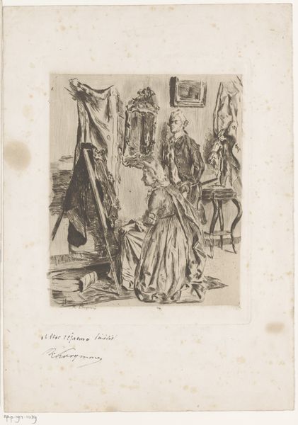 This etching is titled "Die Tanzerin mit dem Affen," or "The Dancer with the Monkey" by Imre Reiner. The dancer's exaggerated, almost skeletal form, hints at the influence of Expressionism, a movement that sought to depict the world through a lens of subjective experience. The print may reflect the anxieties of the interwar period in Europe, a time marked by social upheaval and political instability. The dancer, adorned with a headpiece, stands in a theatrical pose while an ape sits quietly to the side, staring directly at the viewer. The dancer's gesture could be interpreted as an appeal, a beckoning, but to what, or whom? The presence of the monkey invites us to consider questions of identity and representation. Is the dancer a performer, an object of spectacle, or a figure of empowerment? Reiner seems to ask: What does it mean to be seen, and who has the power to define that gaze?