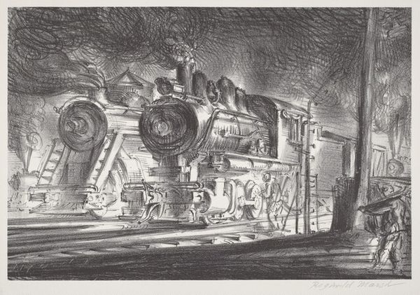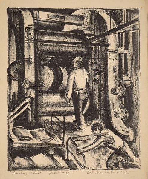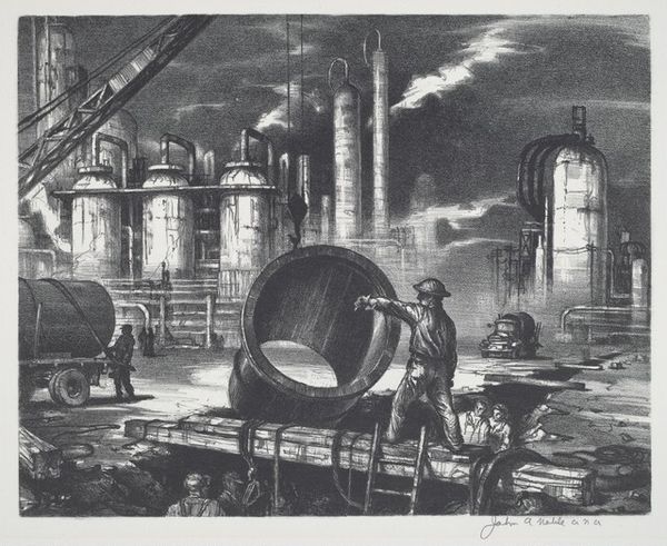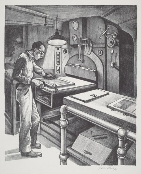 Curator: John Muench's "Men and Steel," created in 1947, is a remarkable print executed with pencil, showcasing an industrial scene. What captures your immediate attention when you look at it? Editor: Immediately, I'm struck by the almost claustrophobic density of the scene. It feels like stepping into a charcoal dream—all grit and heat, with the massive machinery pressing in. You can almost feel the vibrations in your chest. Curator: Muench's choice of rendering this with graphite on paper brings a fascinating tension between the softness of the medium and the harshness of the subject matter. The details about how its constructed are amazing, from the depiction of the labor, down to how the gears would function. Editor: Absolutely. It’s like the artist wanted to tame the steel, domesticate it with the humble pencil. And the light! The contrast between the blindingly hot metal and the deep shadows is almost operatic. Do you think the composition lends itself to themes of labor, or industry somehow? Curator: Without a doubt. Look how he positions the workers in relation to the machines, they're part of a huge interconnected ecosystem. This also echoes ideas within Realism painting and its emphasis on accurately portraying contemporary subjects. Also the consumption the final result suggests. Editor: And there's something about the anonymity of the figures that gets to me. They're almost swallowed by the machinery, rendered as anonymous components within a broader economic process. Is it romanticizing the American industry, or condemning it, with every part played under these systems of capital? I cant seem to get a clear stance from Muench. Curator: Good question. As an artwork deeply rooted in industrial genre painting, it straddles the line. There’s an undeniable appreciation for the raw power and mechanics. But also, the piece alludes to how the worker's autonomy diminishes in relation to their workplace, especially as we exit into a period where labor practices evolve from human autonomy. Editor: So, it’s neither a straightforward celebration nor a condemnation, but something far more nuanced. The effect on my mind overall leads me to think about industry and class division. Curator: Precisely. A picture deeply embedded in its time, asking silent, yet potent questions. Editor: Well, "Men and Steel" certainly sparks questions—and compels us to consider how the artist shapes even the most imposing of materials with the softest of touches.