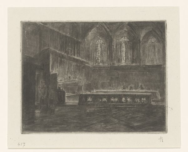 Etienne Bosch made this print of a church interior, sometime between the late 19th and early 20th century, using etching. The lines wiggle and swarm, like a nervous energy made visible. I love how the marks build up to describe the columns and arches, it’s like Bosch is feeling his way through the space. The colour is monochrome, a warm sepia tone, which gives the image a dreamlike quality. You can almost feel the cool, echoing silence of the church. Look closely at the columns on the left; the etched lines aren't perfectly straight, they waver, giving a sense of the immense weight and age of the architecture. This reminds me a little of Piranesi's etchings of Roman ruins, that same fascination with the grandeur and decay of the past. But Bosch brings a more intimate, personal touch. It’s less about historical documentation and more about capturing a mood, a feeling, a moment in time. Art isn’t about fixed meaning. It’s an invitation to wander, to wonder, to get a little lost.
