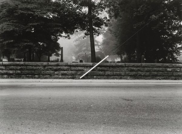 Curator: Looking at James Welling’s "Height Detector, Selkirk, New York" from 1993—a gelatin silver print—I'm immediately struck by its somewhat desolate feel. Editor: Desolate, yes. But in a rather poetic way. The monochrome lends it this timeless quality, almost like an unearthed document. There's a stillness here, a silent observation. Curator: Indeed. Welling seems fascinated by these liminal spaces where nature and industrial structures collide. We've got the stark verticality of the utility poles cutting through what would otherwise be a purely natural landscape. What do you make of those "height detectors," those almost comically out-of-place measuring rods? Editor: Ah, the rods introduce such interesting discordance! The geometric form plays against the organic, blurring what seems to be both marking and measuring the impact of human incursion. They hint at a sort of forgotten, or abandoned infrastructure. It gives a surreal tension. Curator: The high contrast, the stark lines – it’s like Welling is peeling back layers, showing us the bare bones of this location. Do you think this image flirts with the conceptual? It feels so… calculated. Editor: Precisely. Welling meticulously frames these juxtapositions to challenge our perception of the landscape. The composition seems purposefully unbalanced, as if reality itself is a precarious arrangement, right? It reminds us that even in the most seemingly ordinary places, narratives are layered and ready to be discovered. Curator: Thinking about what he captures here in this image—there’s beauty, and certainly quiet commentary, in what many would simply pass by. Editor: Absolutely, I agree entirely. Welling helps us pause, to find resonance and narrative in spaces we usually overlook. A really marvelous thing.