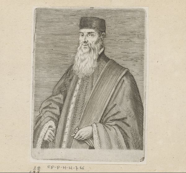 Editor: This is a captivating print from between 1752 and 1766, titled "Portret van Lucas Cranach op 77-jarige leeftijd" – that’s "Portrait of Lucas Cranach at age 77." It resides here at the Rijksmuseum. It looks so intense, a real gaze. What stands out to you when you look at this piece? Curator: The weight of time, perhaps. He stares right through you, doesn’t he? Think of all that an artist active during the Reformation must have witnessed! The subtle lines of the engraving remind me of the fleeting nature of existence itself – how everything, even solid metal printing plates, wears down eventually. What I see here is legacy. And maybe a touch of defiance in those eyes. Editor: Defiance? Tell me more! Curator: Well, he lived a long life, painted powerful figures, and developed a signature style. The northern Renaissance was bubbling with religious and social tension, but here he is, seemingly unburdened by all that, simply *existing*. The engraver has done a marvelous job of catching that. I almost hear Cranach chuckling. Don't you think the folds of his garments remind you of how the roots of a tree entangle, weathering through changing eras, too? Editor: Hah, I see what you mean. You've given me a completely new way to see what might be a portrait celebrating wisdom rather than just old age. Curator: That's art for you! It winks at you differently each time. Editor: Absolutely. Thanks for making this artist's self-regard and long-lived spirit a bit clearer.