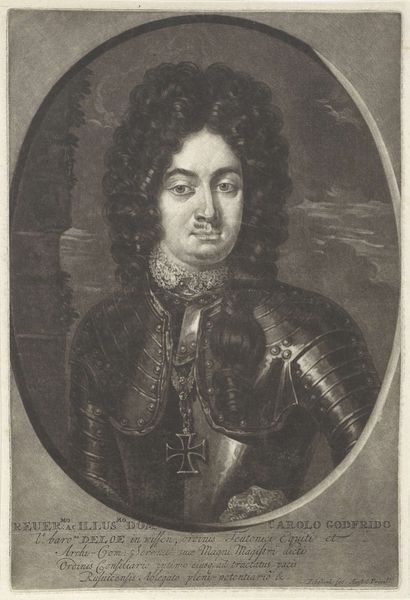 Curator: Pieter Schenk created this portrait of François Lefort as an engraving in 1698. It’s currently housed in the Rijksmuseum. Editor: Wow, that hair is a force of nature! It practically levitates. But despite that impressive wig, there's something melancholy about his gaze. A sense of...burden? Curator: Lefort was a close advisor to Peter the Great and played a pivotal role in modernizing Russia. Perhaps that seriousness reflects the weight of his responsibilities. He helped transform the Russian navy; notice the ships at sea shown in the background of the portrait within the oval border of the picture. Editor: The background detail is really interesting! But my eye keeps getting drawn back to that collar – so much lace. You almost feel like you could reach out and touch it. I'm impressed by the precision rendered through engraving on metal. It makes me wonder about the tactile relationship between the artist's hand, the stylus, and the copper. Curator: Engraving offered printmakers a unique skill set which allowed for the detailed replication of artworks that would be available to the public. The details provide information and communicate authority. Portraits like these served as status symbols, asserting power and commemorating individuals of influence within the court and in the cultural and political life. Editor: Power dressing, baroque style. Makes you wonder what kind of conversations this image might have sparked at the time. Did people focus on the man, or the message? Were portraits used as political tools to garner loyalty? And, honestly, what kind of pomade kept that hair so high? Curator: Exactly. Think about how images of rulers are disseminated today. The strategic use of portraits is an ongoing process in leadership and national governance. Editor: It’s humbling to be looking at art spanning over 300 years of human creativity. Curator: A testament to the power of image making through centuries.