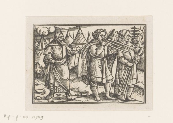 This is an anonymous print, titled 'Moses with singing and dancing women', now held in the Rijksmuseum collection. The composition is neatly split into two halves: on the left, we see women playing instruments and dancing, while on the right, Moses brandishes a sword. This division is not merely visual; it sets up a dialectic between celebration and judgment, a dynamic tension that animates the entire scene. The figures are rendered with precise, economical lines, a technique that emphasizes form and contour. Look closely at how the artist uses hatching to create depth and shadow, giving volume to the figures. In semiotic terms, the sword and the musical instruments act as potent symbols, embodying themes of divine law and human expression. Moses is set apart from the figures in the background and foregrounded to the right. Ultimately, the print invites us to consider how binaries of law and joy, control and freedom, are not fixed but fluid, constantly renegotiated within the frame of human experience.