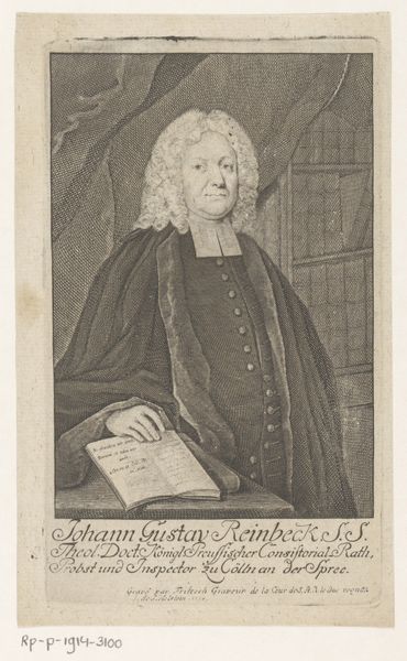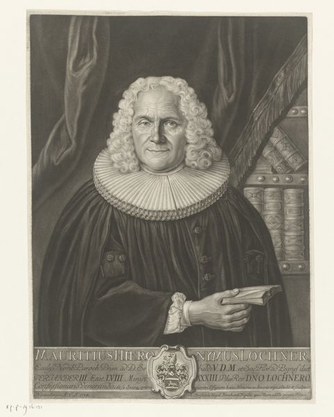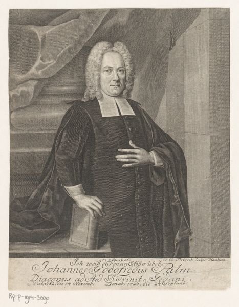 Curator: Allow me to introduce you to "Portret van Friedrich Schultze," an engraving dating back to 1740, currently residing here at the Rijksmuseum. It's a Baroque print crafted by Johann Martin Bernigeroth. Editor: My initial impression is…serious. And rather grand, wouldn't you say? There's a certain formality to the composition; it’s staged, yet imposing, with a hint of melancholy about the eyes. Curator: Precisely. Engraving, as a printmaking process, demands precision and control, mirroring the societal emphasis on order during the Baroque era. Bernigeroth’s use of line and shadow works to carefully craft the social identity of the subject, Friedrich Schultze. Editor: The textures are fascinating for a print—the wig looks almost foamy! And the weight of that book, barely supported by his hand, adds another layer. What do you make of the curtain, dramatically swept to the side like that? Curator: The curtain and the bookcase serve as symbolic props, indicating Schultze’s profession and intellectual environment. Also the script along the bottom provides Schultze's extensive titles. Editor: It feels deliberate, like Schultze is consciously presenting himself in a specific way, surrounded by the tools and signifiers of his trade. A bit of subtle propaganda, perhaps? I wonder, what’s behind those books? What thoughts are brewing behind those thoughtful eyes? Curator: These portraits served as important markers of social standing and professional achievement in their time. Consider the networks of patronage and the skill required for these engravings; such imagery broadcasted power. Editor: That level of control – from the artist to the sitter – intrigues me. Every detail meticulously planned and executed to present a particular narrative. There’s a real artistry there. The textures feel so real! Curator: And Bernigeroth masterfully harnessed the process of engraving, etching, and line to achieve that reality and make statements that would influence viewers for centuries. It's a potent reminder of how images shape our understanding of history. Editor: Well, thinking about the social implications, power structures and image, I won't look at another 18th-century portrait in quite the same way! Thanks for lending me a new historical context!