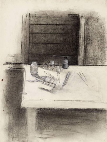 Curator: Gazing at Lorenz Frølich's "Still Life in White and Grey" from 1837, I find myself immersed in a hushed, almost contemplative atmosphere. The objects seem suspended in time, cloaked in subtle gradations of light and shadow. Editor: Indeed, that quietness is quite compelling. But looking at it from a feminist perspective, I see these domestic objects – a water jug, bowl, carafe – hinting at the unseen presence of women and their often-unacknowledged labor in the 19th century. A silent, grey space occupied by their everyday rituals. Curator: It’s more than just a snapshot of domestic life, I think. It's like Frølich is orchestrating a subtle symphony with simple forms and minimal palette, isn’t it? Notice the soft transitions; there are no abrupt lines here. He’s not chasing perfection. Editor: The way the objects are rendered, though "realistic", it’s filtered. We’re seeing whiteness not just as a colour but as a dominant cultural ideal – the purity, cleanliness, and virtue often imposed upon women during that era. And also about colonialism: we think about sugar, and porcelain arriving into Denmark from afar. Curator: Oh, I see what you’re driving at! Yet, isn't there also something beautiful about the artist's focus? These muted tones create such a serene effect, almost meditative. I get completely lost in the silvery glow. Editor: Perhaps. But that very serenity could be argued as a kind of imposed ideal. The domestic sphere presented not as dynamic, vibrant, or filled with activity but as calm, muted, and obedient. Think of Ibsen's *A Doll’s House* published just four decades later. It's all a façade! Curator: So much weight hangs on a few simple vessels rendered in grey. I admire how a seemingly humble artwork on paper—in charcoal no less—can open so many doors into unexpected conversations. Editor: Exactly. What might at first glance seem like a simple still life can actually provoke very uncomfortable and vital social critique, sparking further discussion on power, identity, and representation. The image never becomes silenced by history.