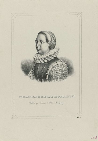 Curator: Here we have "Portret van Magdalena Moons," a print created circa 1838 and part of the Rijksmuseum collection. The engraver, G.F. Eilbracht, captured this image with a keen eye towards romantic ideals. Editor: It's striking! There’s something almost severe about the woman’s expression, but the puffed sleeves and delicate frame add a layer of, perhaps, Romantic aspiration, as you said. The starkness contrasts the ornate detailing beautifully. Curator: Exactly! Moons was a significant figure. While this image dates to the 19th century, Moons lived during the Spanish occupation. Her defiance of societal norms when she refused to marry the Spanish commander, became a potent symbol of Dutch resistance against foreign rule. This print, decades later, serves to continually underscore the importance of liberty. Editor: You can almost see the weight of that expectation in her eyes. Formally, the piece is compelling. Look at the lines of the engraving: they are precise, creating a play of light and shadow that defines her features, particularly around her face and shoulders. The frame surrounding the portrait mirrors the intricate detail of her garments, creating a structured viewing experience. Curator: The clothing itself, with its puffed sleeves and pearl embellishments, evokes status, but they serve a secondary function. Consider the pearl as a visual stand-in for resilience. This is cultural memory embodied, constantly reminding the viewer about what was at stake for those living in the Dutch Golden Age. Editor: It’s intriguing how such rigid structures and symbols still create such palpable emotion. Her steady gaze, even reproduced through print, makes for an undeniably moving experience. I noticed too that this has a high level of technical skill for an engraving on paper. The gradations achieved give volume and weight to someone memorialized in history. Curator: That enduring gaze certainly transcends time. Her face is forever a touchstone. Editor: An unexpectedly affecting piece! I walked away with a better appreciation for not only her time period, but this enduring historical moment captured with such artistic flair.