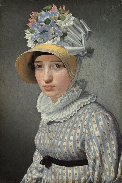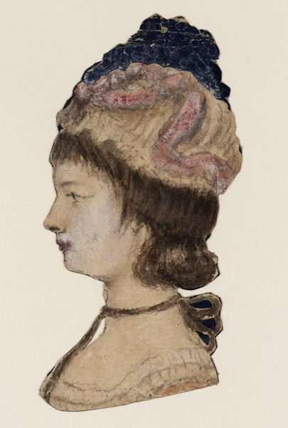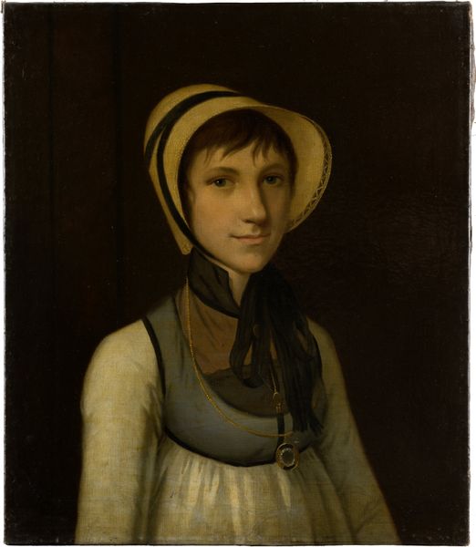 Benjamin Greenleaf painted this portrait of J.L. using watercolor on ivory. The profile view and compact composition create a sense of intimacy, drawing us into the subject’s personal sphere. The subdued palette, dominated by soft pinks, whites, and browns, evokes a delicate and refined sensibility. Greenleaf’s meticulous attention to detail is evident in the rendering of the lace bonnet and collar, where the intricate patterns suggest the sitter’s status and taste. The artist’s skillful use of line and texture defines the subject's features, subtly revealing character and individuality. The overall effect is one of understated elegance, inviting contemplation of identity and representation. The flat, dark background isolates the figure, further emphasizing the sitter’s presence, but also perhaps hinting at the social constraints of the time. The portrait is not just a likeness but a carefully constructed image, reflecting societal values and individual aspirations. This interplay between form and content allows us to engage with the artwork on multiple levels, continually questioning its meaning and relevance.