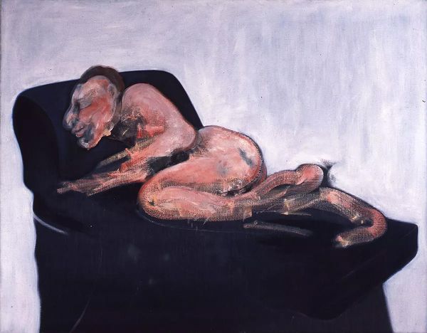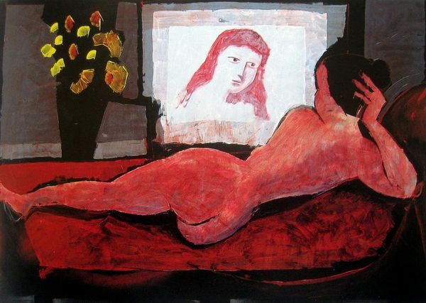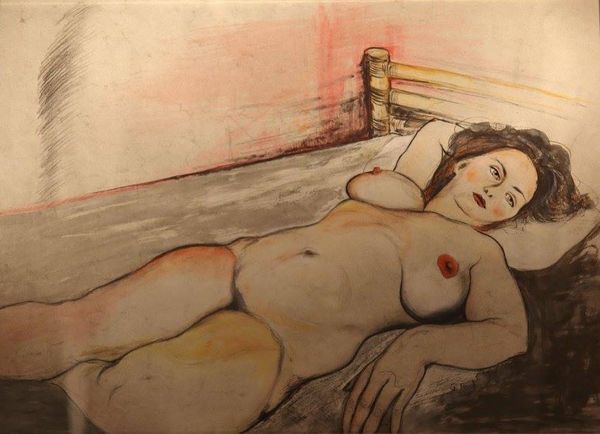 Curator: Here we have Gazmend Freitag's 2008 work, "Gabriele on the bamboo bed 1," a drawing painted on paper, using mixed media: watercolors and inks, maybe some oil. Editor: Ah, yes, immediately the pose—that languid, almost vulnerable relaxation, that feels very intimate. A peek into a private moment, maybe. Curator: Indeed. The reclining nude, viewed from behind, is a staple of art history, tracing back to classical antiquity. It is also, invariably, fraught with potential to either express the sensuality and softness of form, or to reflect societal dynamics related to spectatorship and eroticism. Freitag works deftly with line here. Editor: Precisely, it avoids feeling overly...posed? And it does so because of the lines, that energy, almost chaotic scribbling effect going on. And the bed! Looks as lived in as she does. Makes you wonder about stories the room could tell. The pink, that feels odd, a modern sort of discordance in this otherwise fairly realistic image, no? Curator: The bed as a symbol, specifically, holds powerful associations with the threshold between conscious and unconscious, love, intimacy, the origin of life, and also the place of death. Freud placed dreams, and invariably the bed, as central to interpreting one's selfhood. Freitag seems to consciously employ an arsenal of such potent symbols in his painting. The stark contrast between the dark, almost harsh linear hatching on the blueish bedclothes and that diffused pink area in the background is very powerful, for the eye and perhaps also for one's feeling. Editor: And even just the *style*, right? The "neo-expressionist" tags jump out; how everything teeters on the edge of dissolution. It captures a mood rather than rendering every detail perfectly—that really speaks to that liminal dream state, doesn't it? Almost a memory more than something present. Curator: Absolutely. He taps into those fleeting, subjective qualities, those ambiguous zones that haunt our perceptions. It all reverberates beyond just the surface representation, as only great paintings will. Editor: It's got a certain boldness too—a defiance of classical expectations that makes you sit up and notice. Thank you for opening up its layered depths for me. Curator: My pleasure, a rewarding meditation for both of us I believe.