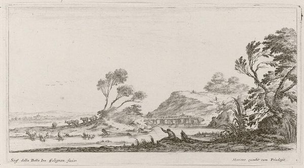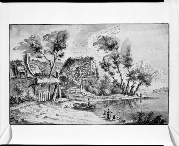 Editor: This drawing, attributed to an imitator of Guercino, is called "Landscape." It's a simple ink drawing, but the composition is compelling. What do you see in the arrangement of elements within this work? Curator: The stark contrast between the meticulously rendered foliage in the foreground and the more loosely sketched background establishes a visual hierarchy. Note how the artist uses line weight and density to create depth. Editor: So the composition guides our eye through the scene. Does the somewhat unbalanced design—with more detail on the right side—have any significance? Curator: The imbalance creates a dynamic tension, preventing the scene from feeling static. Consider how the leaning tree mirrors and contrasts with the distant hill. The structural oppositions are thoughtfully explored. Editor: It's fascinating how much can be communicated through such simple lines. Curator: Indeed, the formal elements, carefully considered, are sufficient for profound expression.