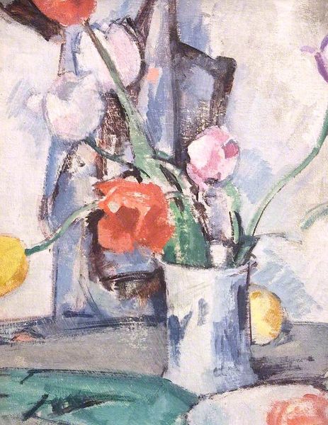 Curator: "Still Life, Red Roses" painted by Samuel Peploe in 1931. Peploe, a Scottish Colourist, renders a scene of domestic tranquility in oil on canvas. Editor: The immediate feeling I get is of hushed stillness—a paused moment, just after breakfast maybe. The muted color palette with those surprising bursts of pink makes it feel intimate. Curator: The painting certainly invites quiet contemplation. It's an exemplary piece demonstrating Peploe's mastery of simplifying forms and using color to create atmosphere. Consider how Post-Impressionism shaped his approach, taking inspiration from French painters while injecting Scottish sensibility. Editor: Right, that sense of interiority feels loaded. You have the teacup, suggesting domestic routine. However, flowers – especially roses – traditionally signify more than just decorative object. In the early 1930s, did still lifes serve as a subtle commentary of bourgeois values? Or even the precarity of beauty itself during economic depression and brewing European conflict? Curator: A valuable connection, that sense of unease. During this period, many artists worked with symbolism. Roses, for instance, held traditional associations of beauty and transience. By setting this subject inside domestic life, Peploe could very well be expressing views about social structure through what seems like decorative forms. The placement of the newspaper also gestures towards a wider world beyond the walls, Editor: That's interesting when considering gender, too. In an era when domestic roles of women were socially dictated, an artwork like this one prompts considering the female experience in these contexts. Does this still life celebrate or subtly critique the confinement within such boundaries? Or perhaps neither, existing in the comfortable space between critique and resignation. Curator: Perhaps Peploe aims to find aesthetic solace amid social flux. He paints a world observed and considered but does not demand explicit readings. It invites endless debate about purpose. Editor: It speaks to the multiple possibilities within art: how it captures intimate experience within a social tapestry, and encourages us to confront our roles within it.