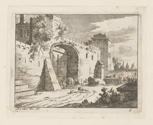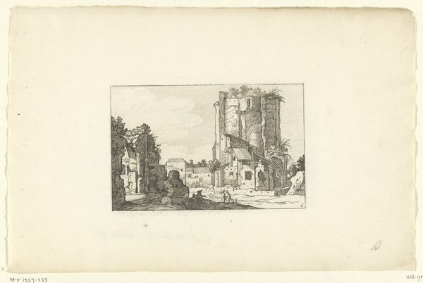 Editor: Here we have Claes Jansz. Visscher's "Travelers at an Inn," created in 1618 using ink and engraving. It feels like a scene from a fable, somewhat surreal with its mix of architectural ruins and everyday life. What do you see in this piece, especially in terms of its context? Curator: What I see here is not just a simple landscape, but a reflection of the socio-political climate of the Dutch Golden Age. The inn, the travelers, the ruins – they're all symbols. Consider the inn as a space of temporary refuge, a place for social interaction but also potential conflict. How might that reflect the dynamics of a society grappling with rapid urbanization and shifting social hierarchies? Editor: So, you're suggesting the artwork comments on social stratification and maybe the uncertainties of travel at that time? Curator: Precisely. The travelers represent various social classes thrown together. Look at the ruined buildings; they remind us of the past and failed empires but could also speak to the fleeting nature of earthly power. The landscape, therefore, is not just a backdrop but a stage where societal tensions play out. The "genre painting" thematics are intertwined with class issues. What might the choice of ink as a medium communicate? Editor: Perhaps its accessibility means the image could reach a wider audience, spreading social commentary further than oil paintings only for the wealthy. Curator: Exactly! The engraving, then, is not just a technique but a conscious choice to engage in a dialogue about accessibility and democratizing art in a changing world. Editor: This reframes my initial perception. It’s no longer a quaint scene, but a commentary on societal dynamics and accessibility through art. Thank you. Curator: My pleasure! Recognizing art's power as a vehicle for these conversations is key.