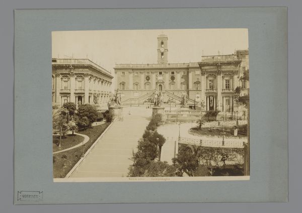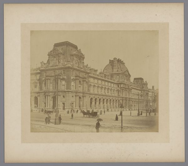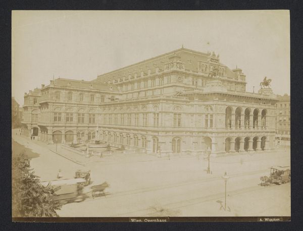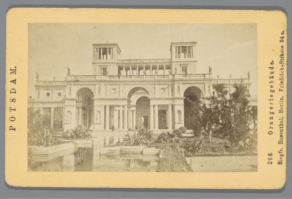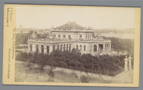 Editor: This is "Gezicht op de Kursalon Hübner in Wenen," a photograph, dating from around 1875 to 1885, and the photo studio seems to be M. Frankenstein & Co. It's quite a grand cityscape, almost like a stage set. What draws your eye when you look at this image? Curator: For me, it’s about understanding what the Kursalon represented at this time. Beyond just being a place for entertainment, these salons became significant social spaces, particularly for the rising bourgeoisie. How does this image reflect or perhaps even challenge existing power structures through leisure and representation? Consider how access to spaces like this intersected with class and gender. Editor: So, the act of portraying it then becomes political in a way? Highlighting this new social sphere? Curator: Precisely! Photography democratized portraiture and architectural documentation, allowing broader audiences access to imagery previously reserved for the elite. Now, consider the architecture. Those classical elements—columns, arches— speak to a desire for legitimacy, aligning the bourgeoisie with established power structures while simultaneously carving out their own space. The “Kachdruck vorbehalten” reinforces concepts of copyright, artistic ownership and the art world power dynamic. Editor: It’s fascinating how much is communicated just through the image and text included in the image. I hadn’t considered how the act of documenting could also be a statement in itself. Curator: Absolutely. Think about who is included—or excluded— from this picture. Are we seeing the whole story, or is this a carefully curated representation intended to project a certain image? Understanding the nuances reveals the socio-political undercurrents present in even seemingly benign depictions of city life. Editor: Thank you. It gives me a lot to think about regarding the intent of photography itself, not only as capturing a moment in time, but a social narrative. Curator: My pleasure. Seeing the art within its complex cultural moment makes this so exciting.