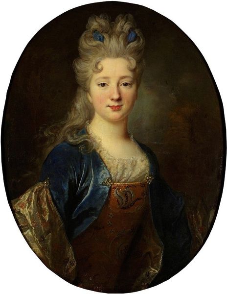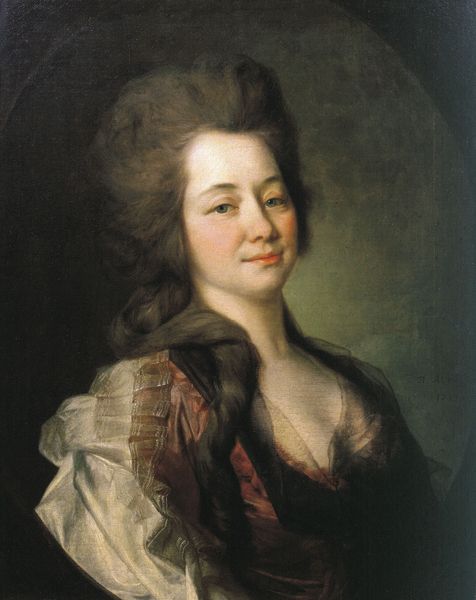 Curator: Looking at this, I get a real sense of quietude. She has this knowing gaze that makes you wonder what stories those eyes could tell. Editor: Yes, there's a certain intimacy. But I'm immediately drawn to the construction of this portrait; the layers of fabric, the visible brushstrokes. It screams of labor, the literal materiality involved in both its creation and subject's social presentation. We're looking at "Portrait of Grand Duchess Maria Feodorovna," created by Dmitry Levitzky around 1785, in oil. Curator: Levitzky really captured her essence. There's something vulnerable, yet powerful about her expression, despite all the formality. Those delicate lace ruffles seem almost to soften the otherwise rigid royal presentation. Editor: I can’t help but consider those ruffles as symbols of textile production. Who spun the thread? Who wove the fabric? What were the working conditions like? These are often invisible yet crucial components. Look how the light catches the details of the embroidery. What kinds of threads did they use? Gold? Silver? What's the market value relative to an ordinary woman’s labor at the time? Curator: Absolutely, it's all interconnected! For me, it is compelling how Levitsky uses the traditions of courtly portraiture to show character. You know, capturing more than just status; hinting at Maria Feodorovna's humanity, if you will. The delicate highlights around her eyes suggest more than just what meets the eye. What about her life choices that are symbolized in her very image. It is more than an academic excercise for sure! Editor: Precisely. And Levitzky's technical skill should also be admired, a certain facility and handling of paint, all while working within the patronage systems of the time. Academic, but also revolutionary for bringing focus on labour. Curator: Well, examining the material components, from pigments to textile production, certainly deepens our understanding. So thanks for illuminating those previously dim areas. Editor: And thank you for showing me a little of the Grand Duchess! Let’s dive into our next artwork with renewed perspective.