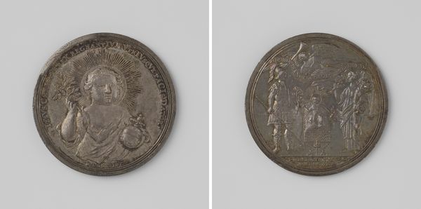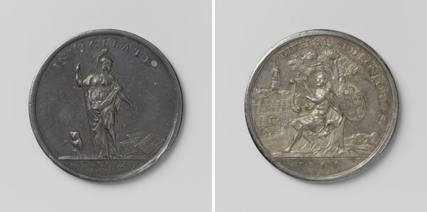 Editor: This is the Vroedschapspenning of the city of 's-Hertogenbosch, made in 1765 from metal by Theodorus Everardus van Berckel. I am struck by the use of allegory and the seemingly contradictory imagery. It feels very formal and... well, official. What historical context am I missing here? Curator: This piece reflects the sociopolitical climate of the Dutch Republic in the mid-18th century. Look at the iconography. We see both the vigilance of the city government on one side, embodied in the figure of "Invigilate", and then, on the other side, the importance of concord and unity expressed through the lyre player and the motto “Diversa sed Concordes," loosely translated as “Different but in Concord." How might this duality speak to the function of local government during that period? Editor: So, it’s literally about governing… I guess I’m missing a key point, because to me, “different, but in concord” feels a bit too idealistic. What was really happening at that time? Curator: Exactly. The Dutch Republic, while a major power, faced internal divisions between different provinces and factions, like the Orangists and Patriots. A medal like this would serve as a form of propaganda or perhaps aspiration. What statements do you think such idealized imagery are making about the city's aspirations in light of those socio-political rifts? Editor: That’s a helpful reading. It isn't simply a historical record, but an active statement advocating for a certain ideal of governance at a time of tension. The medal seems to be promoting this need for internal unity as being vitally important. Curator: Precisely! And that tension between ideals and reality, the power dynamics embedded within seemingly simple images, are what makes objects like these so fascinating and instructive to our current context. Editor: Thanks! I learned to consider art as part of public messaging; an instrument for civic cohesion during periods of societal instability.