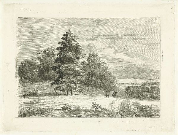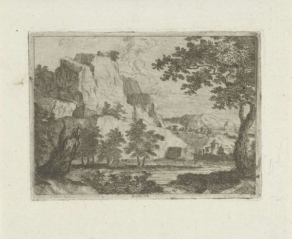 Editor: Here we have "Landscape with a Castle on a Hill" by Wenceslaus Hollar, created sometime between 1625 and 1677. It's an engraving, and there's something almost dreamlike about it. How do you see this piece? Curator: Dreamlike is perfect. It breathes nostalgia for a fairytale never written. See how the light glances off the clouds, barely touching the castle perched precariously on that hill? I wonder, does it promise refuge or imprisonment? Hollar makes me question what’s truly solid and what's fleeting. Does it spark your own stories? Editor: Absolutely, I get a sense of both adventure and foreboding, all rolled into one little print. But it feels like more of a backdrop than a stage for drama. Curator: Good point! It almost feels like a memory fading, doesn't it? Hollar masterfully uses engraving to give us details yet keeps a hazy distance, creating a world you could step into…or perhaps fall right through. Editor: That contrast is so well captured. This makes me appreciate the level of detail he's able to convey even in such a small work. The trees are beautifully delineated in the foreground, almost creating a "close" zone, that then makes the background feel ever more distant and mysterious. Curator: And what stories begin to unfurl now? This work asks you to weave your own adventure, doesn't it? We look into this little snapshot and end up imagining a whole novel of landscape, character and intrigue, not knowing what is imagined or remembered. It's beautiful. Editor: Absolutely. I now have so many more questions about this print than answers. Thanks!