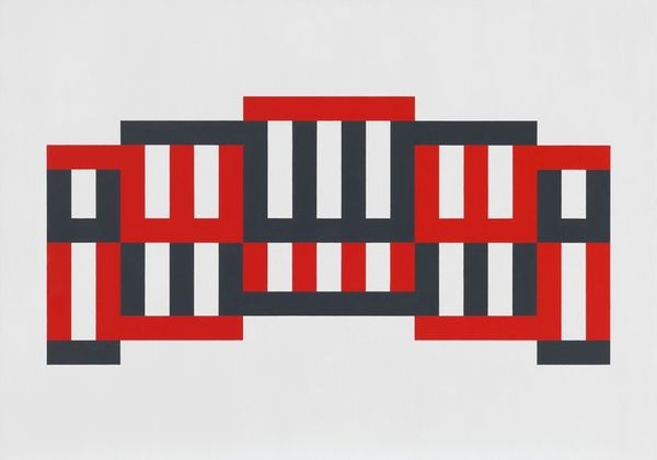 Editor: This is an untitled work by Robyn Denny. The geometric composition in reds, blues, and browns set against a purple background is really striking. How would you describe the visual relationships in this piece? Curator: The orchestration of color is critical here. Note the interplay between the hard-edged forms and the subtle shifts in hue. The chromatic relationships create a visual tension, a push and pull that activates the surface. Editor: So, the relationships between the colors are more important than what the shapes might represent? Curator: Precisely. The forms are merely a vehicle for exploring the potential of pure color and spatial relationships. Consider how the artist manipulates positive and negative space. Editor: I hadn’t considered that. It makes you see how the composition creates its own reality. Curator: Indeed. The painting operates as a self-contained system of visual language.