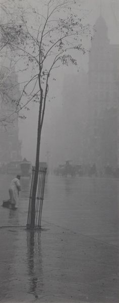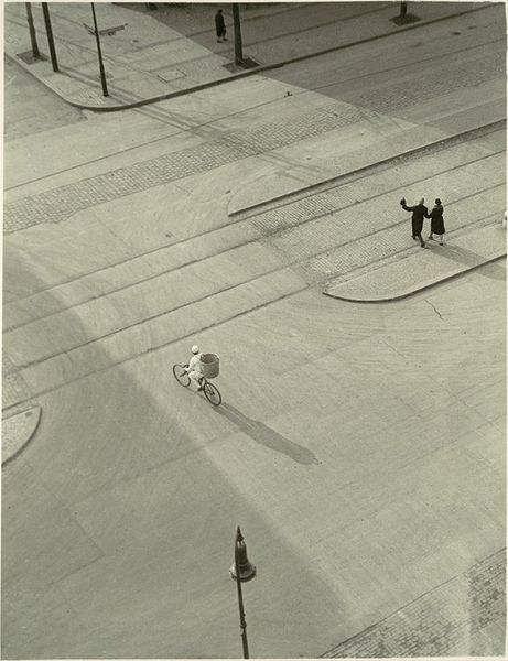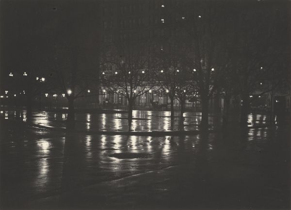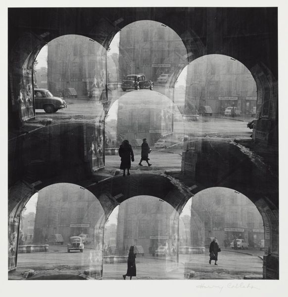 Curator: What a beautifully melancholic scene. This is "Untitled (Street in the Rain)" by Siegfried Lauterwasser. Editor: The way the light hits the wet pavement is striking, creating these wonderfully distorted reflections. It feels almost claustrophobic, hemmed in by the cars and the rain. Curator: Absolutely, and that sense of being trapped is amplified by the high angle, as though we’re looking down, detached and observing. The materials, the slick asphalt, the metal of the cars, become characters in themselves. Editor: I see the way these cars define movement and class. The worker trudging home likely doesn't own one. It shows the stratification of modern life, doesn't it? Curator: Indeed. It’s a potent image of urban life, a world of movement and disconnection. Those shiny surfaces almost mock the pedestrians. Editor: The choice of black and white emphasizes the starkness. It's so fitting. It is the only way to portray such a material and societal imbalance. Curator: Yes, it really enhances that sense of almost cinematic drama. Editor: I'm glad we could delve into its layered meanings. Curator: Me too; it’s a photograph that stays with you.