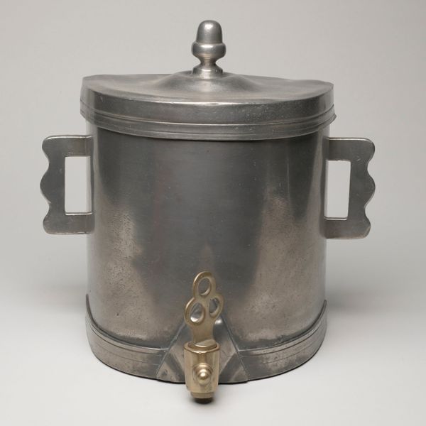Editor: Here we have a "Dinner pail with cover," also known as "Porte-dîner," dating back to the 19th century, now residing at The Met. The craftsmanship seems simple and utilitarian. What secrets does it hold? Curator: Ah, this humble object! Imagine a life, now vanished, where taking your meal with you was a small ceremony. Notice the material; it’s metal, cold, and solid – but imagine it warmed, filled with stew, the steam carrying the scent of home through a bustling marketplace. Do you think the maker saw this as simply a container, or something more? Editor: It's beautiful in its simplicity. Perhaps a statement against extravagance, a focus on function. I guess this dinner pail is from the Bouvier Family? Curator: Indeed! Think of the artisan, Editor – likely a master of their trade, patiently hammering and shaping. The metal, it reflects not just light, but ambition, a quiet pride. A good meal deserves a good vessel, no? Does its starkness somehow make you think of our present time? Editor: I like how, instead of focusing on the dinner pail’s material value, you made me reflect on all the possible histories and meanings it represents! Curator: Every object whispers, my friend. One just needs to learn how to listen! To me, it evokes the quiet dignity of everyday life and makes me wonder about the people who held it and what dreams were stewing along with that dinner!