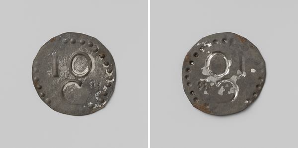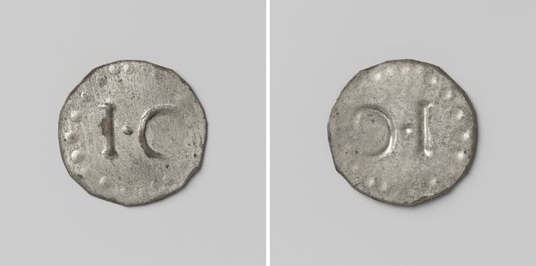 Curator: Up next we have a rather unique metal token—it's identified as 'Strafgevangenis Ommerschans, huismunt geslagen op last van de Maatschappij van Weldadigheid ter waarde van 1 cent.' It’s believed to be from before 1830 and can be found in the Rijksmuseum collection. Editor: It looks so austere. The rough metal and crude stamping really drive home a feeling of… enforced frugality? Even the circular form feels constrained, almost squeezed into place. Curator: It's fascinating how monetary forms shift, and this piece illustrates that transition poignantly. These tokens were created at the behest of the Society of Benevolence for use within the Ommerschans penal colony. Note how the stamping presents two faces of the same object in the visual composition, reflecting the Janus-faced nature of such societal endeavours. Editor: The Society of Benevolence; that moniker alone sets off alarm bells! These institutions always mask complicated, often exploitative, social structures behind well-meaning titles. A one-cent denomination suggests a very limited internal economy within that prison society. The control aspect seems insidious, managing access to even the most basic transactions. Curator: Precisely. Tokens like these serve as tangible metaphors for control, illustrating the power dynamics inherent in these welfare experiments, supposedly about uplifting people. The very object, normally symbolizing freedom of trade and personal value, here reflects social confinement. The number and letter are debossed into the form and they present a distinct face that echoes back and forth across history. Editor: Absolutely. I find myself thinking about the implications on individual identity. This coin isn’t just a marker of economic value, but it serves as an imprint of forced community – a grim, institutional brand on the individual's already limited agency. Were these ever collected as souvenirs, or used beyond the walls, further distorting perceptions? Curator: What remains remarkable is that this unassuming artifact, an anonymous piece born out of the desire for better economic and social reforms, can embody power structures in such an iconic way. Its roughness communicates an intent which becomes an inadvertent testament. Editor: A stark reminder of the ethical quicksand that exists where societal uplift becomes intertwined with social control. A sobering testament in cold metal.