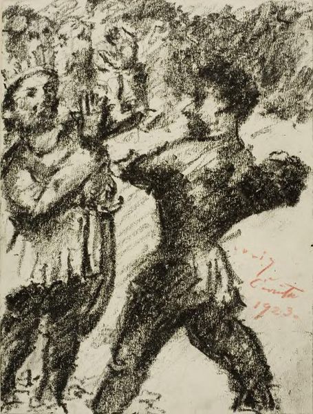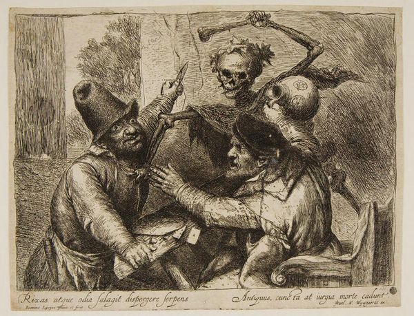 Francisco de Goya created this print, "Absurdity Funeral," using etching and aquatint techniques. The somber scene is dominated by a dense network of lines and tonal gradations, creating a sense of unease. The composition features figures in a procession, with a central focus on a body lying prostrate. Goya’s use of light and shadow adds to the drama, obscuring details and enhancing the emotional impact. The figures, rendered with grotesque features, seem caught in a dance of death. Consider the structural elements at play. The stark contrast between light and dark, and the chaotic arrangement of forms, serve to destabilize any clear narrative. This print underscores the absurd, challenging conventional values and fixed meanings within a society on the brink of transformation. The artwork acts as a semiotic system, where each visual component—line, form, and shadow—contributes to a broader critique of cultural and philosophical norms.