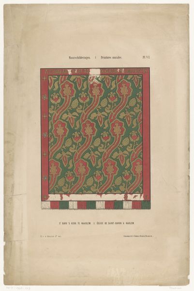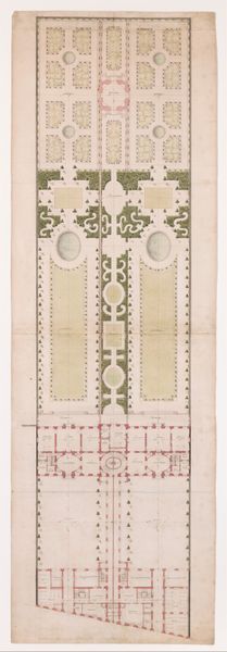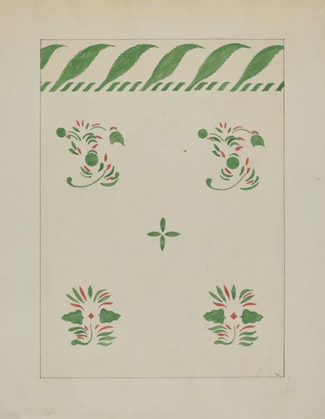 Curator: This work is called "Stencilled Wall Decoration," and it’s believed to date from around 1936. It employs watercolor and stencil techniques. Editor: My first impression is one of simplicity, almost spartan, but there's a deliberate craft at work in these repeating green patterns. It feels...restrained. Curator: Right, the work likely existed as part of a broader movement within decorative arts advocating for affordable and accessible design. We often see such initiatives gaining momentum during the interwar period, fueled by social concerns for improving domestic environments for the working class. Editor: Which is intriguing considering it uses watercolor, typically a fine art medium, to achieve what's essentially a mass-producible motif through stenciling. Do you see any specific influences or sources in this kind of aesthetic approach? Curator: One can find similar design concepts stemming from the Arts and Crafts movement, translated to new aesthetics such as Art Deco streamlining that style’s floral elements into cleaner geometries. Editor: Absolutely, the simplified forms make this versatile. This wasn't intended to be an isolated drawing, but a plan, a pre-cursor to something. Looking closely at the way the green pigment has been applied, it’s interesting. There's subtle unevenness which adds a hand-touched quality. Was that a consideration I wonder? Curator: Yes, the value that was assigned to works such as these shifted over time. What once stood for accessibility later took on new meanings linked to the revival of certain "honest" aesthetics and artistic integrity tied to handcraft. Editor: It reminds me that every designed space relies on unseen labor. Considering the era, do we know much about who was doing that decorating labor? Curator: Unfortunately, information regarding such practitioners is often not well documented; most sources prioritize those leading firms or teaching in design schools over independent decorators or homemakers utilizing stencils within their own environments. Editor: So it hints at larger industries while eliding the lives of individuals involved. Overall I get a sense of this work standing as both a product of and a prompt to production itself. Curator: It's definitely a reflection of its time—a moment of shifting aesthetic and social priorities expressed through design. Editor: It’s been useful thinking through how production shifts across categories of fine art, design and domestic life and labor.