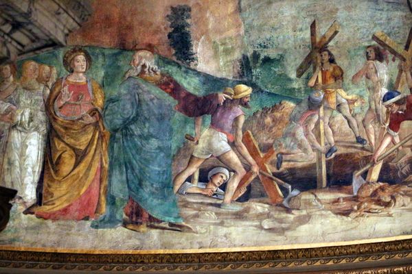 This fresco, "Stories of the Holy Cross" by Antoniazzo Romano, presents us with a powerful symbol: the cross. We see figures carrying the wooden crosses, their presence dominating the composition. This symbol, deeply rooted in Christian culture, signifies not only sacrifice and redemption but also power and faith. The cross motif, however, transcends Christianity. Long before, similar forms appeared in various cultures, symbolizing the intersection of the earthly and divine, or the four cardinal directions. In Romano's rendition, the cross embodies both its immediate religious significance and the echoes of these ancient, universal meanings. Consider how the emotional weight of the cross affects us. It represents suffering, yet also hope. This duality touches something profound in our collective consciousness, a recognition of the cyclical nature of life, death, and rebirth. It is a symbol that has resurfaced, evolved, and taken on new meanings across time.