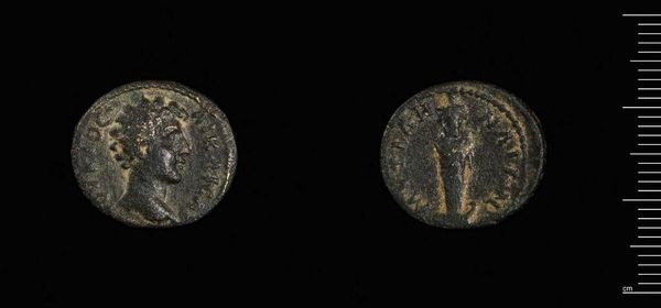 Editor: Here we have a Follis of Crispus from Cyzicus, a small bronze coin. It's amazing how much detail they managed to fit on such a tiny surface. What can you tell me about its composition? Curator: Observe how the circular form dictates the arrangement. The effigy, though degraded, occupies the central field, its presence emphasized by the surrounding legend, which acts as a framing device. Editor: The figure on the reverse is also quite striking. Curator: Indeed. Consider how the linearity of the figure contrasts with the circular field, creating a dynamic tension. Note also the symmetry in the placement of elements. Editor: So, the composition and the use of space are key to understanding this coin? Curator: Precisely. The interplay of form and symbol, though time-worn, still resonates powerfully. Editor: I'll certainly look at coins differently now. Curator: The coin's artistic essence lies in its intrinsic design.