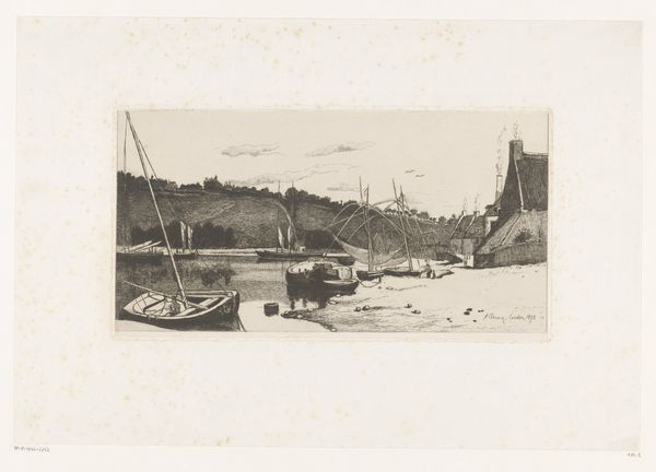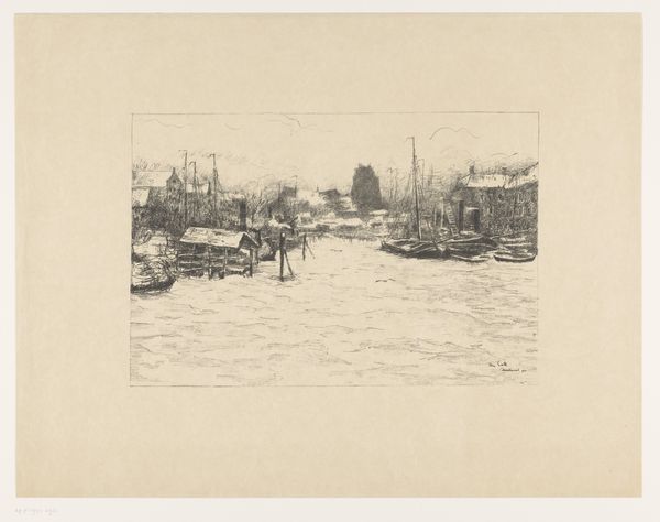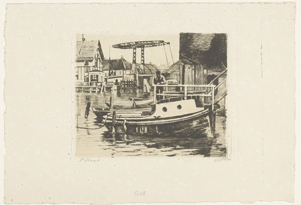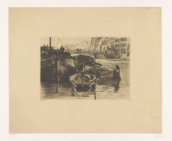 Editor: This etching, "Aangemeerde boten aan het Damrak in Amsterdam" by Willem Witsen, circa 1906, has such a compelling, gritty feel. The monochrome palette really emphasizes the industrial nature of the scene. What stands out to you about this work? Curator: I immediately notice the emphasis on the printmaking process itself. Witsen uses etching – a technique involving acid and metal plates – to depict labor and trade within the Amsterdam cityscape. It bridges a gap between high art and what many would consider mere "craft." How does the choice of etching, a reproducible medium, affect its perceived value versus painting at that time, you think? Editor: That's interesting. So, because it’s an etching, and therefore more easily reproduced, does that make it a commentary on mass production, even in the early 20th century? Curator: Precisely! Consider also the "social context." The Damrak was the city's financial heart. Witsen doesn't romanticize; he shows us docked boats, potentially goods being transferred, highlighting Amsterdam's role in global trade and commerce. What do the blurred figures in the background suggest to you about labor at the time? Editor: Perhaps the disposable nature of the individual worker, obscured and blended into the industrial machine of the city itself. The materials used – the metal plate, the acid, the paper – they're all part of a system of production and consumption. Curator: Exactly! This work beautifully collapses those artificial boundaries between artistic expression and the social realities of production. What did you take away? Editor: I never thought about how much the *process* of creating a piece could be a statement in itself. It gives a whole new layer to appreciate in Witsen's work!