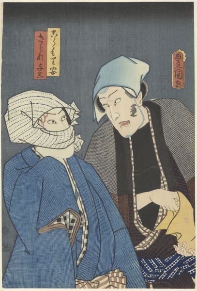 Curator: Let's take a moment to consider this fascinating work, "Russians," crafted by Kunihisa in 1861. It's a vibrant woodblock print, currently housed here at the Metropolitan Museum. It gives us an example of ukiyo-e artistry turned towards observations of unfamiliar cultures. What are your initial impressions? Editor: What strikes me first is the sort of amused detachment in the figures' eyes. It’s like the artist is saying, "Look at these strange birds!" but with affection. The composition itself is so flat, so stylized, but the clothing is rendered with surprising detail. There is definitely a sense of exoticism and a touch of gentle parody in this early genre scene. Curator: Indeed. The artist presents these Russian figures through the lens of Ukiyo-e, a traditional style focusing on 'pictures of the floating world' so the every day; typically scenes of landscapes, theater and courtesans, but here extended to depicting foreigners. This print demonstrates an evolving worldview during Japan's late Edo period. Consider, if you will, the symbols and codes embedded here. The Russian clothing and adornments, slightly exaggerated, are stand-ins for cultural identity. Editor: Absolutely. They’re almost like caricatures, and yet, there's also something quite earnest in the depiction, as though they wanted to capture these visiting Russians in the most meticulous way. I am interested to know more about that cultural exchange. Curator: The Meiji Restoration was approaching, when Japan was on the cusp of opening itself to the West. This print shows that transition, as artists sought to document and understand these previously unfamiliar visitors from other continents, yet remained somewhat tied to tradition. Editor: This print definitely brings us back. It’s charming, slightly strange, but full of a curious sort of respect for the 'other.' I am wondering what those characters scrawled around them meant! Curator: Indeed! Well, I trust our audience feels equipped to delve more deeply into Kunihisa’s visual records of intercultural contact.