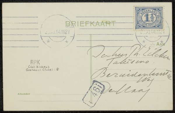 This is a simple postcard to Philip Zilcken by Rose Imel, its function is purely communicative. The formal elements are stark, dominated by a grid of lines that guide the placement of address and message, overlaid with rubber stamps and handwriting. Consider how Imel’s use of space and text creates a structured yet informal composition. The horizontal lines contrast with the verticality of the written address, creating a visual rhythm. The stamps act as a semiotic framework, marking the card's journey through the postal system. Each element—the typeface, the handwriting, the stamps—functions as a sign, contributing to the card's overall meaning. We might consider how this interplay destabilizes the traditional concept of art. Its value lies not in its aesthetic beauty, but in its function as a medium of communication. This challenges fixed meanings and invites a reinterpretation of everyday objects as potential art.