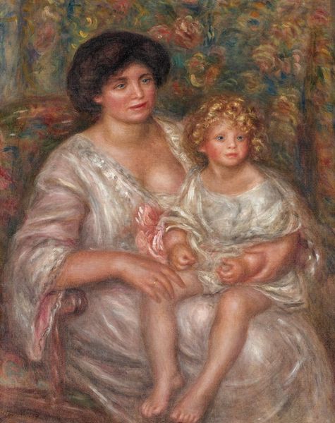 Editor: So here we have Mary Cassatt's "Nude Baby on Mother's Lap Resting Her Arm on the Back of the Chair," created in 1913 using pastel on paper. There's something so tender about the scene, and the textures feel soft and intimate. What do you see in this work? Curator: Beyond the immediate tenderness, I see echoes of the Madonna and Child imagery prevalent in Renaissance art. Consider the stable, triangular composition, the protective gesture of the mother, and even the child’s gaze, which carries a sense of knowing beyond its years. Do you sense any of that visual history here? Editor: I hadn’t explicitly connected it to Renaissance art, but now that you mention it, the pose and the overall sense of calm definitely resonate. It’s interesting how Cassatt modernizes that iconic imagery. Curator: Precisely. Cassatt was keenly aware of art history, using it to subtly elevate and ennoble the everyday experiences of women. Notice, too, how the loosely applied pastel evokes a sense of immediacy, yet the underlying structure feels timeless. The nudity carries an innocence, linking us to artistic traditions while remaining distinctly modern. Does that juxtaposition strike you as particularly effective? Editor: Absolutely. The looseness combined with the clear underlying structure creates a lasting effect, which might add another layer to its meaning. It feels very personal and profound at the same time. I'll certainly keep that in mind going forward. Curator: And hopefully others will too!