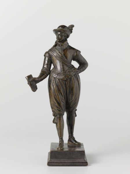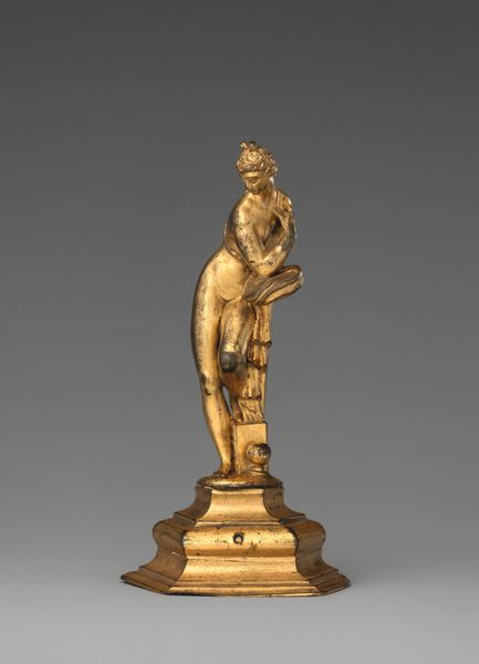 Curator: This bronze sculpture, "Faith," is attributed to Niccolò Tribolo and dates back to the early 16th century. It now resides at the Minneapolis Institute of Art. My initial reaction is drawn to the symbolic representation and socio-political context of that time period. Editor: It’s kinda melancholic, don't you think? She's all draped and covered, gazing downwards almost sorrowfully. She makes me want to cry into my wine glass too...which, speaking of which, is she holding? Curator: The object she holds is a chalice. In terms of broader narratives of power and representation, she represents the allegorical figure of faith—a critical concept in the 16th century when there were dramatic religious schisms and wars happening across the continent. It represents inner resolve during conflict. Editor: Makes you wonder what battles she's seen! That little statue, made of bronze? Must have been witness to some monumental historical changes, religious wars or even people growing in understanding. Did it bring them courage, maybe comfort? Also, is she standing on some kinda tiny sea serpent there at the base? Curator: The small beast at her feet represents defeated heresy, highlighting faith’s triumph over differing beliefs, very interesting in light of intersectionality of belief that came about later. That detail underlines the sociopolitical messages being sent by religious iconography and, more widely, renaissance artwork. Editor: Good versus evil and faith wins out, huh? Simple. Bold. What is interesting is, her eyes look as though they are bound and in shadow—even though they are only hinted at beneath the bind. I'm getting that blindness thing but it has me thinking about the dark side of faith...the way it blinds you to different paths, almost dooming those on the margins. Maybe the artist intended us to pause there. Curator: That's insightful! Examining artworks through lenses of power, gender and marginalization offers richer layers to this piece. The concept of “blind faith”, its cultural ramifications… definitely relevant. Editor: Indeed! This little statuette holds big themes! Like tiny wisdom pills disguised as renaissance art. I find myself oddly comforted now! Curator: By acknowledging historical complexities in this light, we open our analysis to more equitable interpretations. Thanks for prompting those thoughts, editor. Editor: Anytime, Curator. Glad to shake up those Renaissance ghosts a bit!