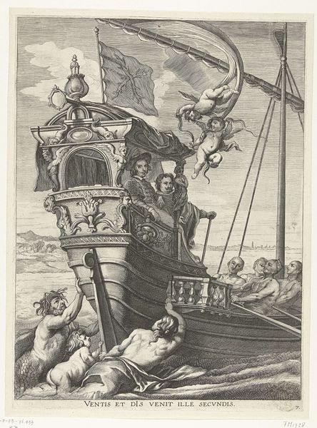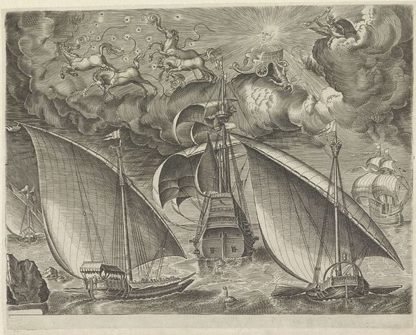 Editor: Here we have Philips Galle's 1566 engraving, "Jonah fleeing the presence of the Lord." The chaotic scene of the turbulent sea contrasts so strongly with the serene, almost dismissive, figure of God in the clouds. What strikes you when you look at this? Curator: The symbolic weight of the storm itself. In the visual language of the 16th century, storms weren’t just weather events. They represented divine wrath, the upheaval caused by defying a higher power. Look how Jonah averts his gaze; he isn’t just physically fleeing, but wrestling with the internal consequences of disobedience. Notice, too, how Galle renders God not as angry, but as a detached observer. Does that evoke any particular ideas? Editor: It’s like God isn't surprised, more like disappointed. And the positioning of God above the storm… is it meant to show his control? Curator: Precisely. And consider the other details—the crumbling ships, the expressions on the sailors’ faces—they represent humanity's struggle against forces beyond its control. This print uses powerful imagery to depict not just a biblical story, but a timeless struggle between free will and divine mandate. What feeling do you leave with? Editor: I initially focused on the chaos, but now I see it as a visual representation of internal turmoil and the consequences of challenging established authority. Thanks! Curator: Indeed, recognizing the long cultural history behind these symbols offers profound insights into art.
