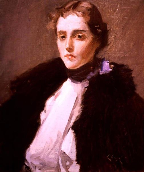 Curator: Before us, we have John Singer Sargent’s oil on canvas, "Portrait of Mrs. Alice Brisbane Thursby," completed in 1898. Editor: There's a kind of opulent restraint in the tones; a lot of blacks and browns softened with creams. A reserved monumentality that must have been carefully considered between painter and sitter. Curator: Indeed. Sargent masterfully employs a limited palette to convey a sense of elegance and sophistication. Observe how the composition directs the viewer's eye. It begins at the subject’s gaze, sweeps down along the string of pearls to the purple flowers pinned on the velvet, and concludes on the richly detailed folds of her maroon dress. The dress and its complex, but carefully composed undulations create both visual interest and texture. Editor: Speaking of texture, consider the actual fabrics – velvet, silk, and those pearl beads. There's a tangible quality; they seem to beckon. It's hard not to consider the material reality of each piece of clothing, where it was woven or grown, how it made its way onto Mrs. Thursby's person, and the cultural impact of that industry. Curator: These portraits by Sargent function as both a record of his skill with the brush and as signifiers of the sitter’s elevated social standing. Notice how her poised demeanor and confident gaze reflect her status. She projects ease, an assured presence, almost as if inviting us into her salon. Editor: I find myself thinking about the labor involved, though. Not only Sargent's brushstrokes, but also the underpaid workers who dyed the cloth and strung those beads. Who sat at home to spin the yarn. So much of art, I find, has hidden histories, beyond the apparent narrative of the elite and elevated. It complicates what is being memorialized here, by adding this shadow. Curator: It also adds to its depth. What do you think we should emphasize for our audience about this work? Editor: I think a lot of different details jump to life when we realize it wasn't conjured out of nothing. These are not merely figures inhabiting some pictorial space but they have their own world, and are composed by work, place, and history.