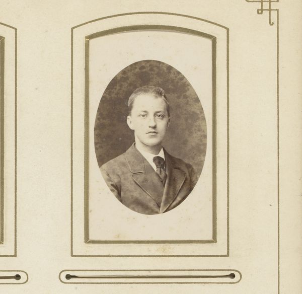 Editor: This is a photographic "Portret van een man" or Portrait of a Man, by A. Lüsson, dating from around 1865 to 1885. It has such a cool, restrained quality. What's most interesting to you about this image? Curator: What stands out is how this seemingly simple portrait exists within a larger cultural and technological moment. The rise of photography in the mid-19th century democratized portraiture. Think about who could afford a painted portrait versus a photograph. It shifted the power dynamic. Who was represented, and by whom? Editor: So, photography allowed a broader segment of society to participate in portraiture, but were there conventions and power structures still at play? Curator: Absolutely. Consider the pose, the clothing, the overall presentation. They signify a certain social standing, even if more accessible than a painted portrait. This image operates within the evolving visual language of representation, signaling class and aspiration. What choices were consciously made, and what societal norms were unconsciously followed? Editor: I see what you mean. The neat suit, the tie, even the way his hair is styled suggests something about how he wants to be perceived. What about the function of these photographic portraits – where might they have been displayed or kept? Curator: Albums, lockets, cartes de visite – these images were widely circulated. They played a key role in constructing personal and familial narratives, but also in presenting oneself to the public, a precursor to today’s social media profile. So this isn't just a picture; it's an early form of visual communication shaped by complex social forces. Editor: That gives me a lot to think about in terms of how this artwork represents power dynamics of the 19th century. Thank you! Curator: And for me, to consider the evolving definitions of portraiture!