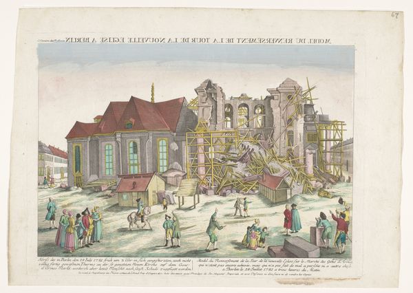 Curator: Let's consider this print, "The Destruction of Jerusalem," made sometime between 1755 and 1779. It combines engraving, watercolor, and what looks like colored pencil. A chaotic scene of war and fire really dominates. What jumps out at you initially? Editor: The layered effect is pretty striking. It almost feels staged, even though the subject matter is quite violent. The city feels more like a set piece and the application of colour almost industrial – a flat, economic wash. What does that choice tell us about the artist's goals and the intended audience? Curator: Excellent observation! Notice the means of production: engraving, printmaking, watercoloring – these are repeatable processes, relatively efficient for distributing images and information, which highlights the print’s social role. Its purpose lies perhaps less in ‘artistic expression,’ but rather in delivering specific cultural or moral ideas through widely available images. Think about who could afford such a print. Editor: So, this isn't necessarily meant to be high art consumed by the elite. It's speaking to the growing middle class who want to be educated and morally instructed. Does that explain why the violence is somewhat stylized or softened? Curator: Precisely! And let’s delve deeper into the ‘destruction’ itself. Consider the labor involved, the cost of materials for printmaking at that time, the social impact of spreading these images that, as you noted, make the fall of Jerusalem almost palatable. Were there other similar images? What might these represent to its intended contemporary audience? Editor: So, by analyzing its production, the choice of readily available materials, and the distribution potential, we can better understand its social purpose. I hadn’t considered the artistic merit coming from that aspect before. Thanks for providing a different lens for observation. Curator: Absolutely. Looking at art through a materialist perspective opens up new questions regarding labor and social context often missed. It moves beyond the question of aesthetic expression, emphasizing instead what its creation tells us about that era.