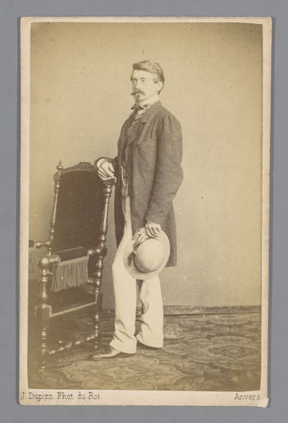 Curator: This striking daguerreotype from 1861 is titled “Portret van de schilder Ferdinand Wilhelm Pauwels, ten voeten uit,” and it's attributed to Joseph Dupont. My immediate reaction is one of restrained dignity; the subdued sepia tones lend the image a gravitas that reflects, perhaps, the subject’s artistic status and societal position. Editor: Dignity, yes, but also perhaps a reflection of the constraints of early photography. This isn’t a casual snapshot. The stiff pose, the meticulous detail in his patterned pants – they all speak to a performance of identity as much as a portrayal of the man himself. There’s something inherently political in deciding how you present yourself to the relatively new medium of the camera. Curator: Absolutely. Studio portraiture in the mid-19th century was about constructing an image of oneself for posterity. Ferdinand Pauwels, a successful painter of historical scenes, would have been acutely aware of how he wished to be perceived. Note his tailored coat, the carefully knotted tie – these are signifiers of bourgeois respectability, designed to cement his position within the art establishment. The chair on which he leans provides an additional element of status, indicating wealth and access to luxury. Editor: It also subtly positions the subject in a passive, almost staged manner. His gaze isn't directly at the viewer, instead he's glancing towards the right of the camera frame, contributing to the artificial atmosphere. I’m interested in how photographic portraits like this, in their staged reality, contrast to painting’s claim to capturing authentic expressions, specifically those painted during the same period. Curator: Indeed. Photography complicated the notions of artistic realism. Pauwels’ artistic training was rooted in Academic Art and realism movements, so perhaps his willingness to embrace photography as a mode of representation speaks to photography’s growing validation at that time. Editor: I think it's safe to suggest there is power to having a visual likeness of yourself distributed at this time. This image creates access, particularly as photography democratizes image production. Considering his background and historical context, the portrait isn't just a visual representation; it's a calculated assertion of identity, class, and artistic standing that enters the social fabric and leaves its mark in the visual history of the era. Curator: It’s an image that encapsulates so much about the relationship between art, society, and representation at a pivotal moment in history. Editor: An early engagement with the now all too familiar dynamics between seeing, being seen, and wanting to be seen in particular ways.