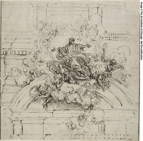 This print, "Mand met bloemen", was created by Pieter van den Berge, sometime in the late 17th or early 18th century. At first glance, the detailed rendering of the floral arrangement, set against the stark white background, commands attention. The composition is dense, almost overflowing, with varied textures and forms inviting close inspection. Van den Berge masterfully uses line and shadow to create depth and volume, drawing the eye from the delicate petals to the sturdy basket. The arrangement, while appearing natural, is highly constructed. This reflects a structured view of nature, aligning with the period's scientific classifications and the human desire to impose order on the natural world. The print serves as both an aesthetic object and a document of its time, inviting us to contemplate our relationship with nature. The print’s function is not merely decorative but intellectual, reflecting the complex interplay between art, science, and philosophy.