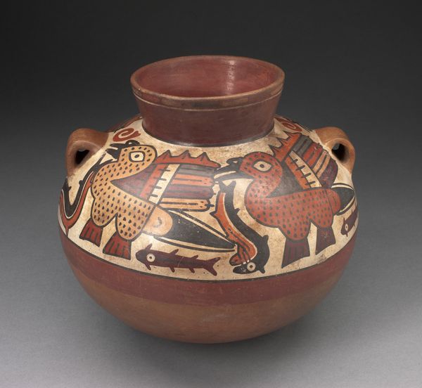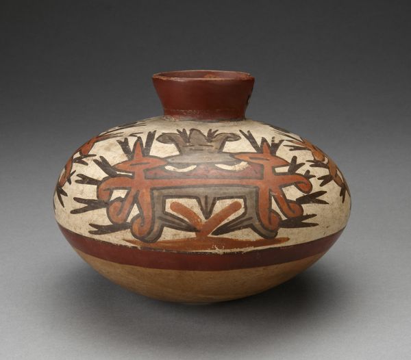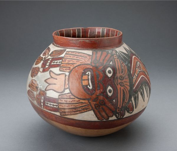 Curator: Welcome. We are looking at an earthenware bowl originating from the Nazca culture. It's called “Bowl Depicting Birds and Flowers” and it’s dated to around 180 to 500 ACE. What's your immediate reaction? Editor: I find it quite charming. There's a pleasant earthiness to the color palette and the simple depiction of natural elements – very grounding. Curator: It exemplifies classic Nazca pottery, showcasing their mastery of polychrome decoration on ceramics. Note how the artist uses the curvature of the vessel itself as part of the compositional structure. Editor: Indeed, and I am immediately drawn to how the decorations—stylized birds interspersed with flora—tell us about the culture. The careful rendering suggests a deep connection to nature, where perhaps these avian figures had special symbolic or ritual importance. It makes me wonder how women may have used, cared for, and passed this on. Curator: The formal arrangement is noteworthy as well. Look at how the dark horizontal bands accentuate the bowl's shape, creating distinct visual zones that control the eye’s movement and contribute to its overall sense of balance and proportion. Editor: That’s an astute observation. But when one examines the social function of the artifact itself, we could examine whether the vessel might have been used in ceremony, or placed within tombs for funerary rites, pointing toward rich understandings of life and death, regeneration, and the cosmos in ancient Nazca society. What was its purpose? Who crafted it? I have so many questions… Curator: What I appreciate most, though, is the formal integrity. Each motif, each color choice is thoughtfully considered within the larger structure. This integrity speaks to a sophisticated visual language, don’t you agree? Editor: Absolutely, I do agree, and thinking about what that visual language may suggest adds another dimension to our understanding of Indigenous experiences and cultural memory from this period. I appreciate the simplicity, in that respect. Curator: A marvelous artifact to consider indeed. Thank you for your time and your insight. Editor: My pleasure, and likewise.