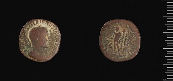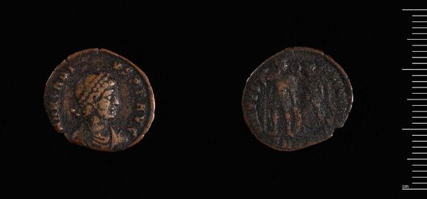Curator: This is a bronze coin, likely from Antioch, depicting Valentinian II. Look at the wear on it. You can see the marks of circulation, the physical signs of its use in the late Roman Empire. Editor: It feels so weighted with history. Beyond its financial purpose, consider the message it conveys – power, imperial reach, and the face of the Emperor constantly circulating in the hands of the people. Curator: Absolutely. The materiality of the coin itself speaks to the vast network required to produce and distribute it. Where was the metal sourced? Who were the artisans involved in its creation? Editor: And how did the distribution of these coins shape the social and economic landscape? Currency normalizes an image of power, embedding imperial authority into everyday life. Curator: Indeed. I find myself reflecting on the coin's journey, from its creation to its present state, a tangible link to a complex past. Editor: It's a potent reminder of how power manifests and circulates, both then and now.