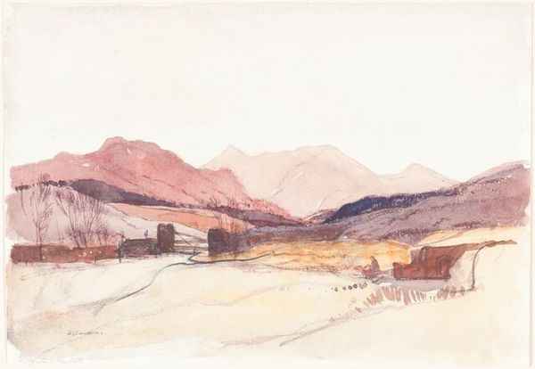 Curator: Oh, this landscape whispers of somewhere ancient and untouched. The pencil lines almost feel like runes etched onto the page. Editor: My eye immediately goes to the paper itself – the way the watercolour sits so lightly on the surface. You can almost feel the texture of the handmade paper. And of course, this is "Schichallion" by David Young Cameron. Curator: It's the ethereal quality, isn’t it? Like seeing a memory of a place rather than the place itself. Notice how the mountain peak just barely kisses the horizon? There’s a real sense of the sublime here, a romantic longing. Editor: But it's more than just feeling; consider the actual labour. Someone mined those graphite and ochre pigments, someone processed and sold them. There's a direct link to industrial history in this quiet scene. Curator: Yes, but it transcends the simple recording of labor. For me, that subdued palette is so evocative; muted pinks and blues layered like sediment over time, and they make me dream. Editor: Absolutely. Those choices speak volumes about the artistic circles in which Cameron moved and marketed his artwork. These works were commodities of beauty but made within definite supply chains. I can almost see the specific pencil and type of brush used on the artwork! Curator: In a way, those very supply chains fueled the artist's escape *into* the sublime. The landscape becomes a site of refuge. Editor: It is funny when considering consumption; who would want an image of hard physical labour in the early 20th century? Rather, someone wants something 'pure' as they retreat to their weekend cottage. Curator: It just highlights the dual nature of art, doesn't it? Both of you, always intertwined. I look at this again, and a peaceful melancholy drifts from the art. Editor: And now, thinking again about the materials, I notice so many slight alterations and amendments... This watercolor holds more layers, and labour, than initial view suggests!